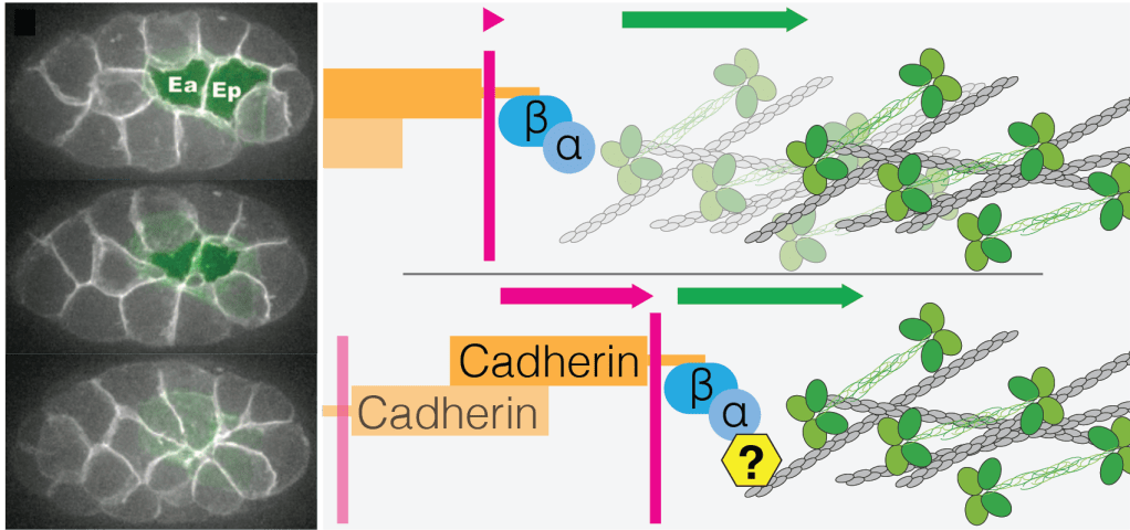 Gastrulation in C. elegans occurs via apical constriction, a conserved mechanism to change a cell’s shape and initiate morphogenesis in broad range of animal systems. C. elegans gastrulation begins with two endodermal precursor cells (E cells) that apically constrict and internalize. Apical constriction occurs as a result of actomyosin contractions at the apical surface, which pull on cell-cell junctions and shrink the exterior face of the cell. Surprisingly, data suggests that both actomyosin contractions and strong apical tension precede shrinking of the apical cell surface. This suggests that a temporally regulated link allows for the coordination of the contracting apical actomyosin networks with the apical cell-cell junctions to trigger apical constriction. We hypothesize that this link represents a protein that is produced, or activated, just before apical constriction begins and facilitates a connection between junctions and the cytoskeleton – which we call the molecular clutch mechanism. My current work uses proteomic and bioinformatic approaches to identify potential regulators of this mechanism.